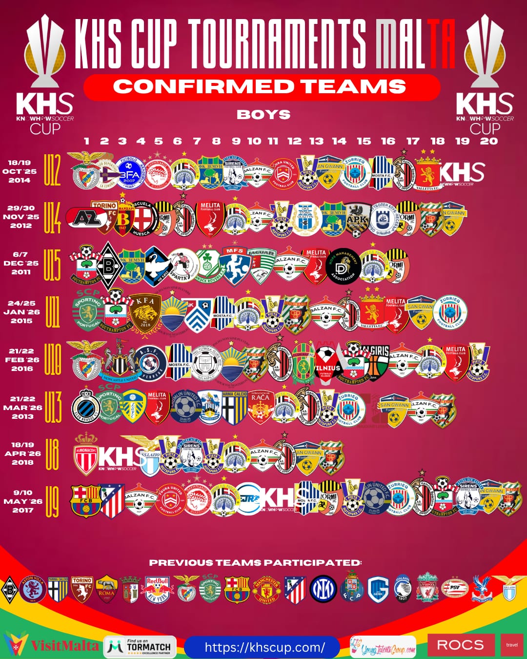 Upcoming Tournaments Home » Upcoming Tournaments KHS Cup Under 14 Dates: 29/30 November 2025Venue: TBA, Malta Register Your Team Now! KHS Cup Under 15 Dates: 6/7 December 2025Venue: TBA, Malta Register Your Team Now! KHS Cup Under 15 Girls Dates: 17/18 January 2026Venue: TBA, Malta Register Your Team Now! KHS Cup Under 11 Dates: 24/25 January 2026Venue: TBA, Malta Register Your Team Now! KHS Cup Under 10 Dates: 21/22 February 2026Venue: TBA, Malta Register Your Team Now! KHS Cup Under 13 Dates: 21/22 March 2026Venue: TBA, Malta Register Your Team Now! KHS Cup Under 8 Dates: 18/19 April 2026Venue: TBA, Malta Register Your Team Now! KHS Cup Under 9 Dates: 9/10 May 2026Venue: TBA, Malta Register Your Team Now! Confirmed Participating Teams